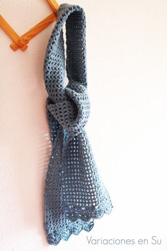 Hace unos días terminé de tejer esta bufanda de ganchillo, en un punto muy calado y con un cierto aire vintage. Una vez puesta, le da un aspectoromántico al outfit, y el color, entre gris y azul, favorece bastante.