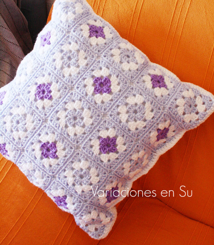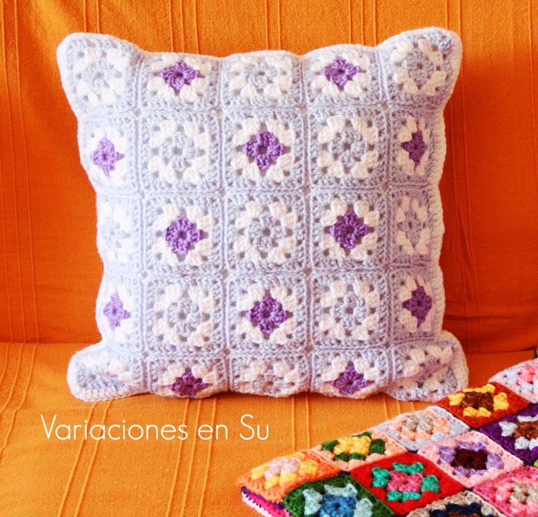 Hoy os traigo unas imágenes de un cojín de ganchillo hecho con granny squares que he tejido. La funda es extraíble para poder así lavarla sin problemas.