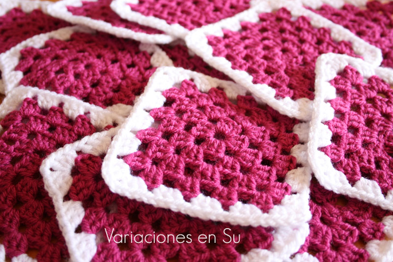 Poco a poco os iré mostrando los progresos, ya que la manta tendrá unos cuantos colores y no sé cuánto tiempo me tomará hacerla. De momento os dejo una imagen de los granny squares o cuadrados de ganchillo acabados en magenta, que son los primeros que he hecho. Me encanta este color 🙂