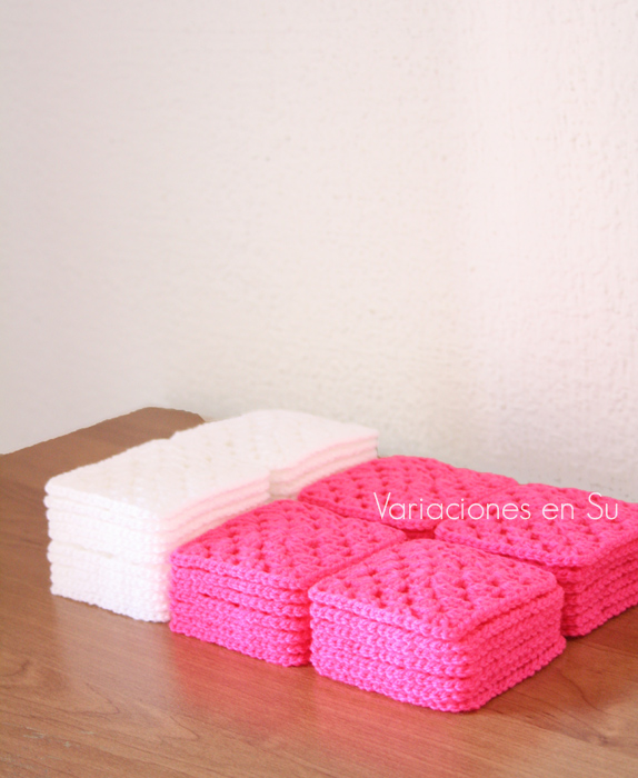 Ahí están todos los cuadrados preparaditos (son 48 en total esta vez), en los colores rosa flúor y blanco, esperando para ser unidos y dar forma a… ¡un nuevo cojín de ganchillo!