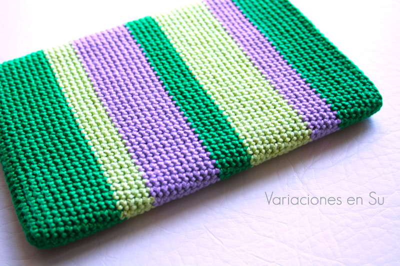 Funda de ganchillo para e-reader tejida con hilo de algodón mercerizado en los colores verde botella, verde pistacho y malva.