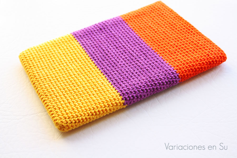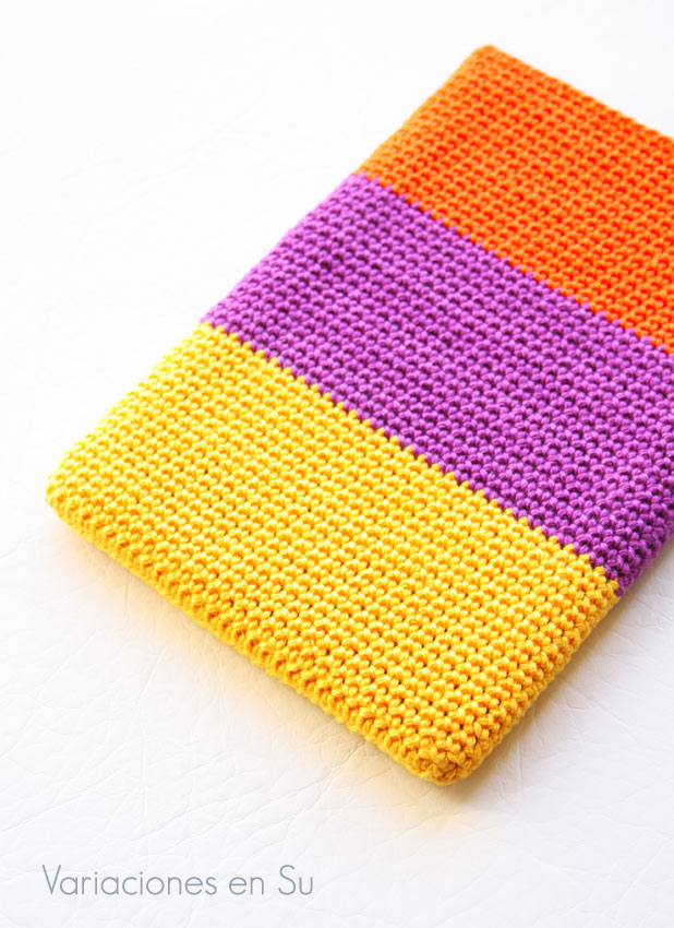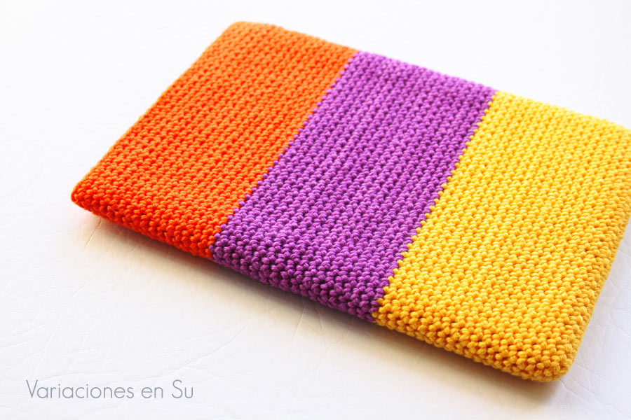 Funda de ganchillo para libro electrónico (e-reader) tejida en los colores naranja, violeta y amarillo.