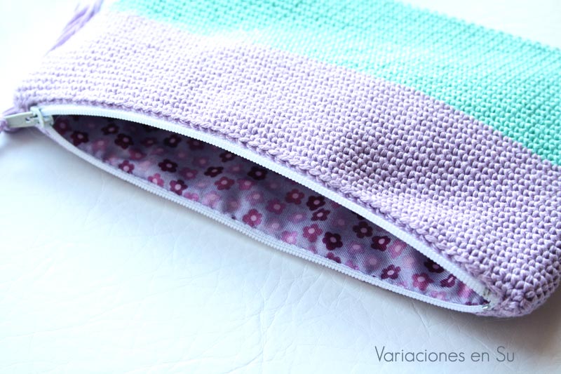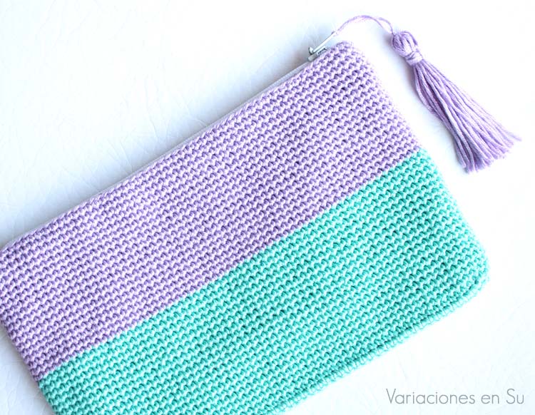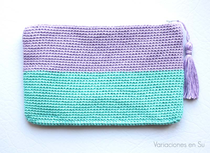 Colorido neceser de ganchillo tejido con hilo de algodón en los colores malva y verde. Ideal para guardar el maquillaje o cuaquier otra cosa que queramos proteger en nuestro bolso o maleta.