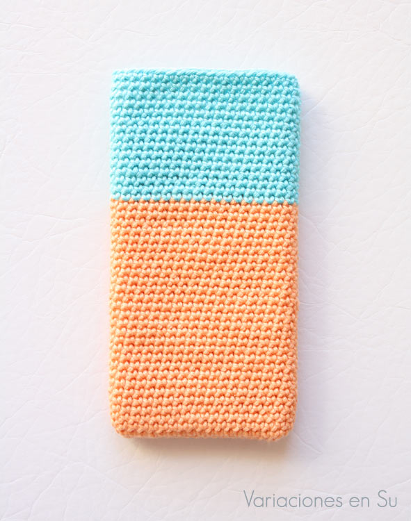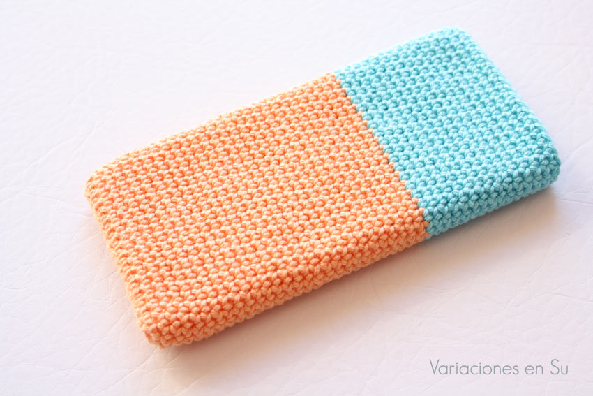 Funda para móvil tejida a ganchillo con hilo de algodón mercerizado en los colores azul turquesa y salmón.