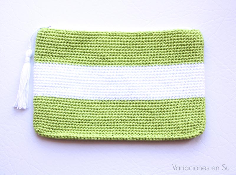 Neceser de ganchillo tejido con hilo de algodón en los colores verde y blanco. Cuenta con cierre de cremallera, está forrado en su interior e incorpora una borla decorativa para facilitar su apertura.