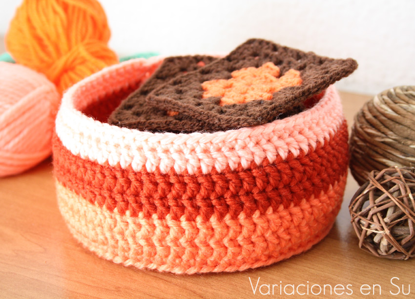 Cesta de ganchillo en tonos naranjas