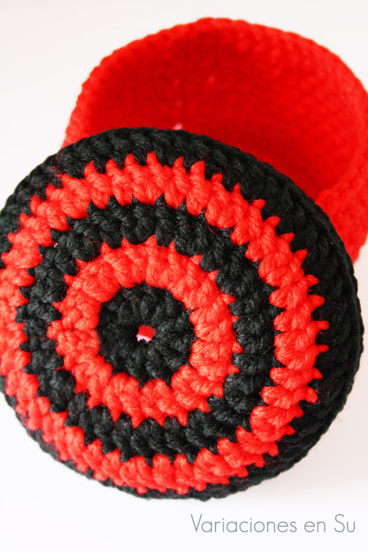 Una cesta de ganchillo tejida en los colores rojo y negro, con tapa incluida, y que, según como la mires, parece un pastelito 🙂 Besos, Su